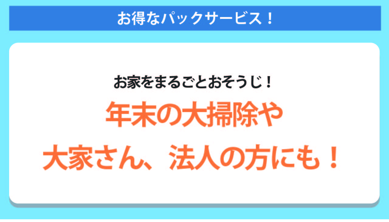 お家をまるごとお掃除する、単品で頼むよりお得なパックサービスです。 年末の大そうじや、引越し前後、新生活に向けてのお部屋のおそうじにもおススメ。 大家さんや法人の方にも。